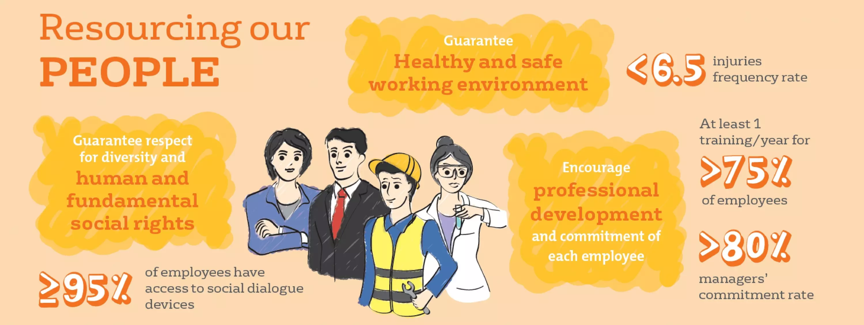 Veolia’s performance highly depends on the talents recruited and retained in the company. The motivation and mobilization of our employees is our wealth and strength, our priorities include skills and career development, recognition of our employees and their performance as well as respecting their diversity. We have therefore established an ambitious training and HR development policy. A mechanism is also developed which aimed at our managers and more closely associates them with implementing our strategy.