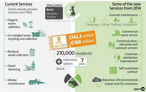 The new contract comprises the services which Veolia has provided to the borough since 1992, including recycling and refuse collections, street cleansing and winter maintenance. In addition, the new contract includes the additional services of grounds maintenance of parks, open spaces and Brent Housing Partnership land.